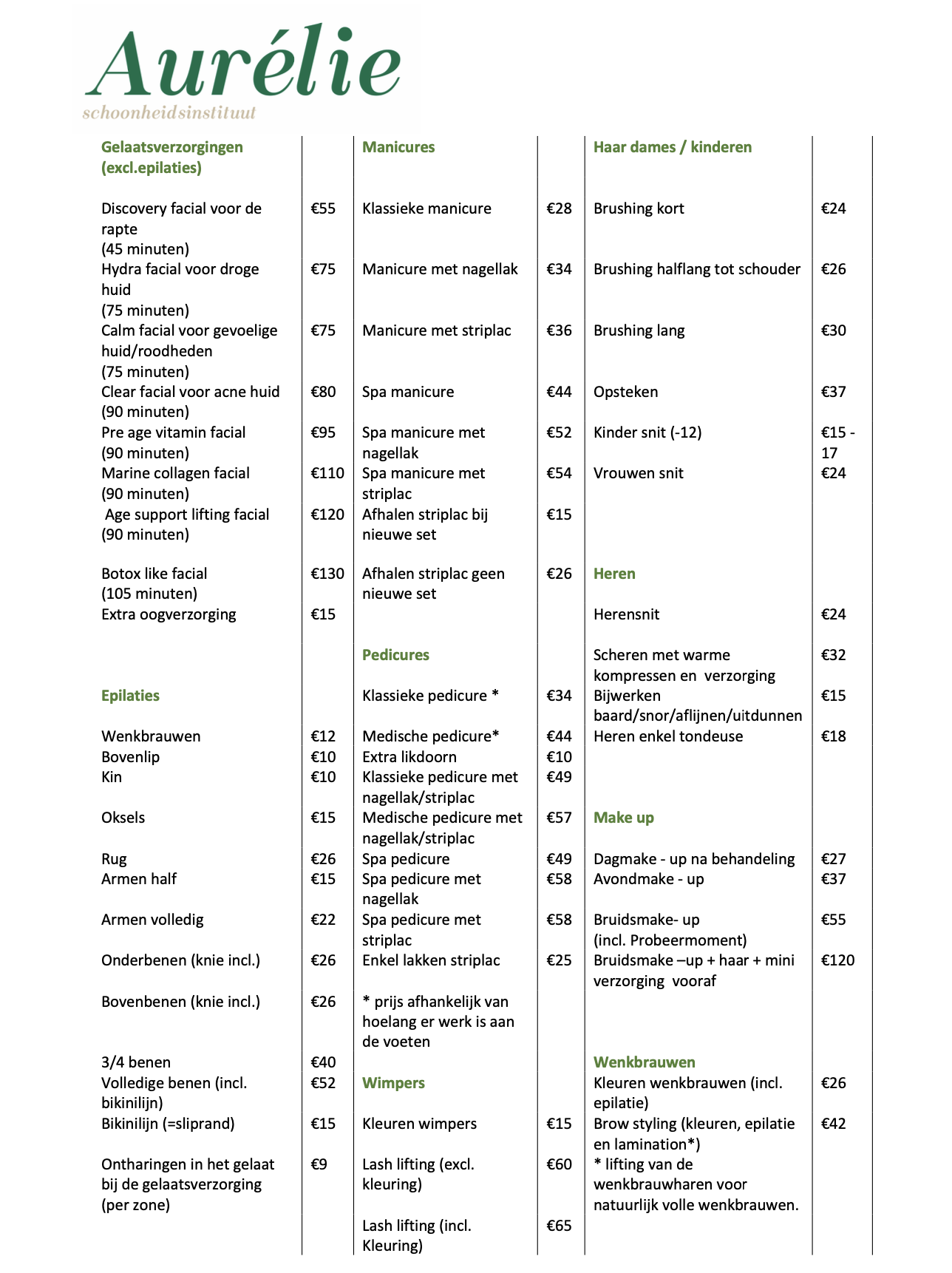 Gelaatsbehandelingen: Discovery gelaat ° Hydro, calming of clear gelaat ° Pre age gelaat ° Botox like gelaat ° Marine collageen behandeling ° Anti age wellness behandeling - Pedicure - Manicure - Lakken met nagellak of striplac - Ontharingen - Make up - Gelegenheidskapsels - Brushing - Herensnit - Scheren mannen - Kindersnit - Puntjes bijwerken - Lash lifting - Brow lamination. Prijslijst en toelichtingen gelaat staan op de fotoband hier onder en gaan in vanaf 1 januari 2025 . via de pijltjes kan je scrollen op de band.